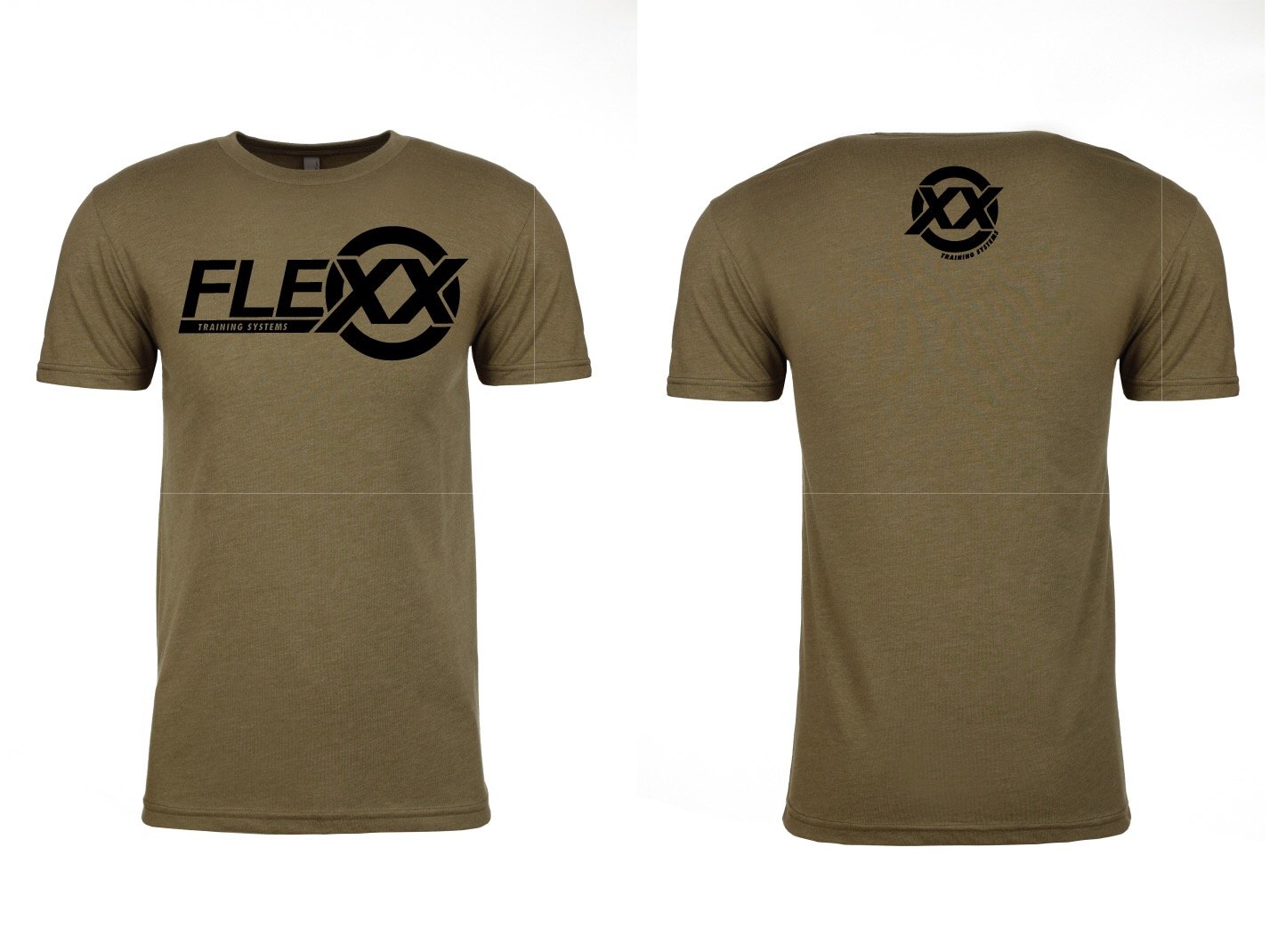 Army green tee with black OG Flexx logo, small XX logo on back.