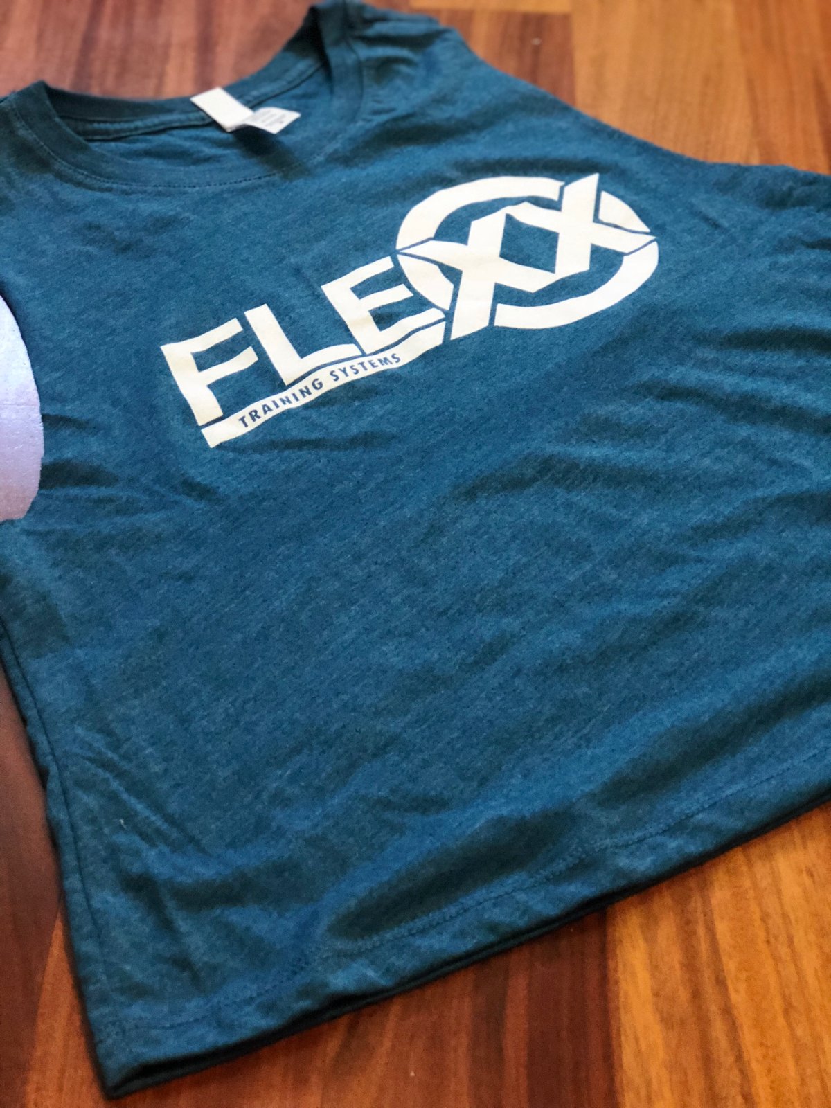 Heather deep teal racerback tank with white Flexx logo on front and small XX on back