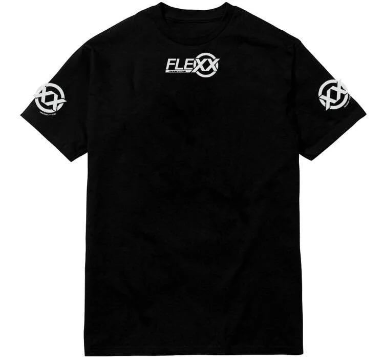 Black tee with white OG Flexx Training Systems logo on the front and the small XX logo on the sleeves designed to show on your competition singlet.
