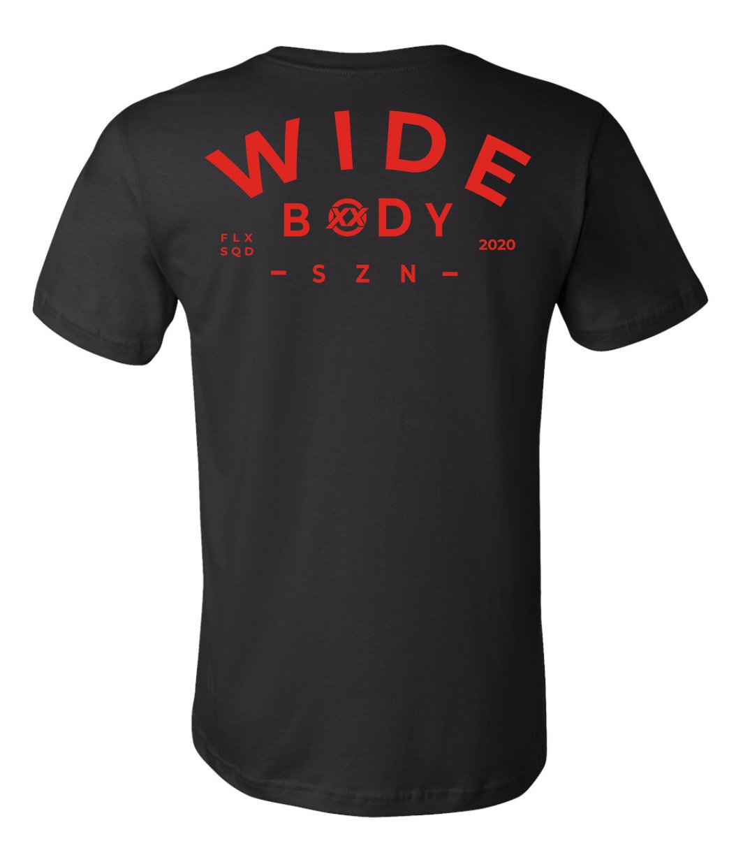 Flexxxxxxxxing widebody tee printed on a black Next Level 6210 tee.